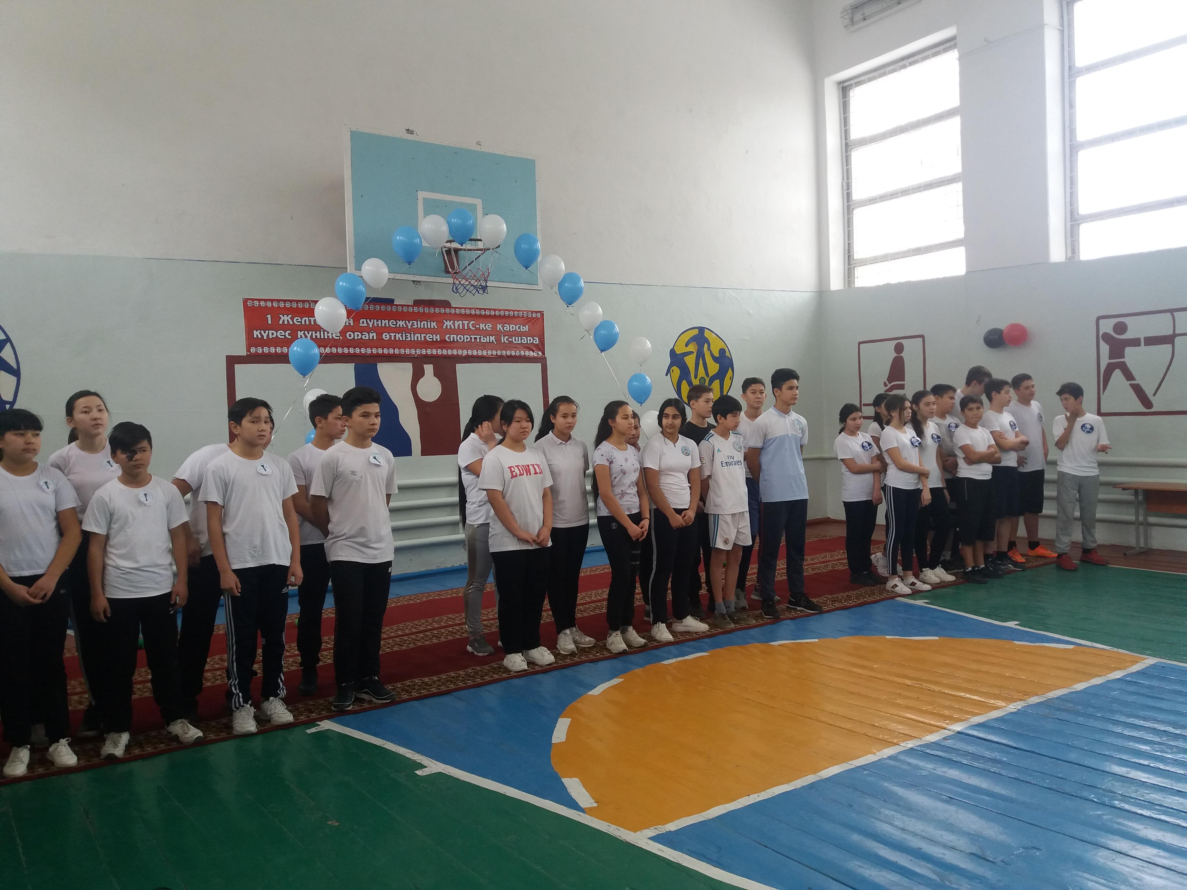 1 желтоқсан – Дүниежүзілік ЖИТС-ке қарсы күрес күніне орай мектептің спорт залында 8 сыныптар арасында тәрбие орталығының және дене шынықтыру пәні мұғалімдерінің ұйымдастыруымен спорттық жарыс ұйымдастырылып, өткізілді