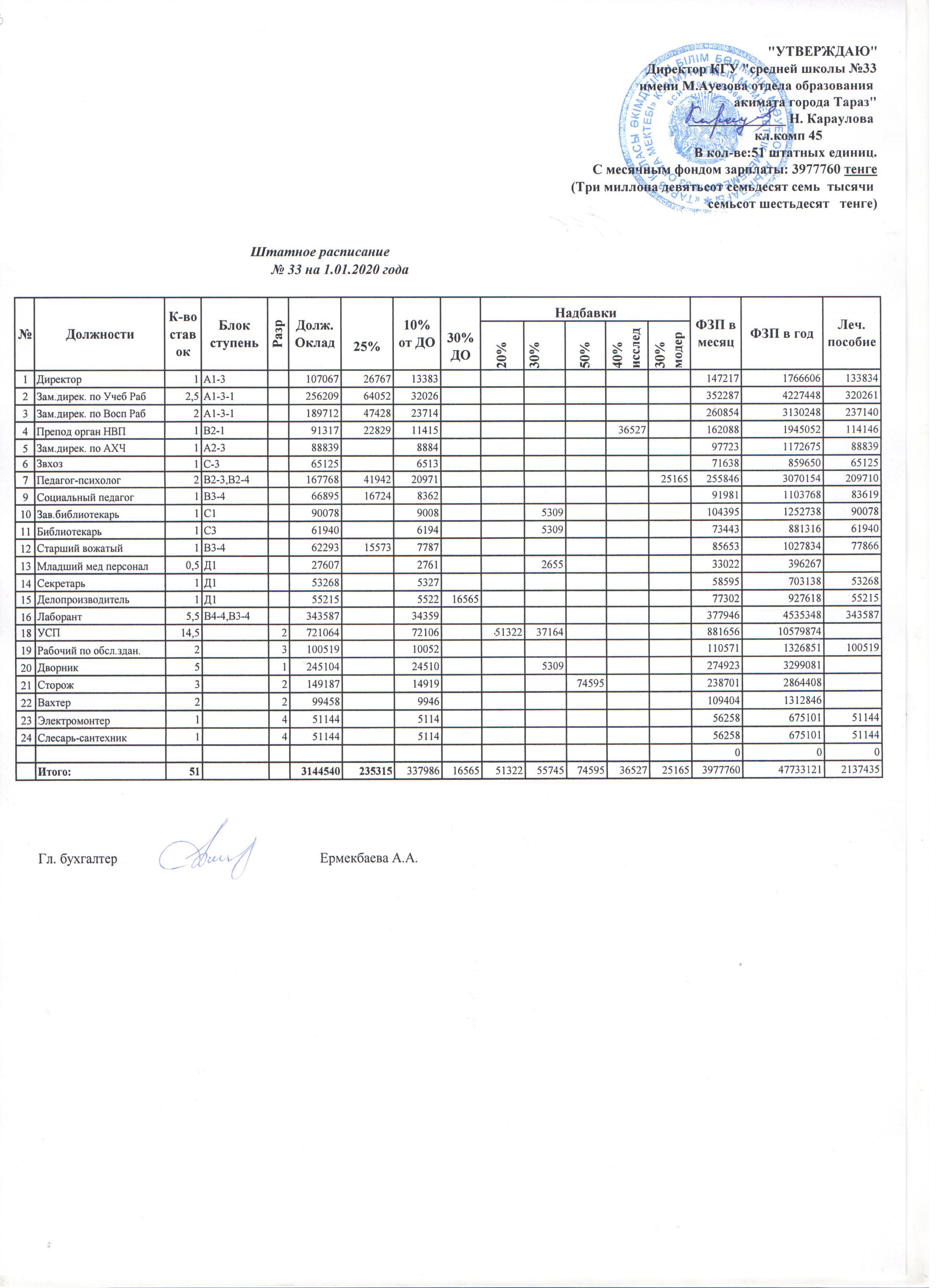 » » » 01.01.2020г. штатное расписание сш №33 имени М.Ауэзова
