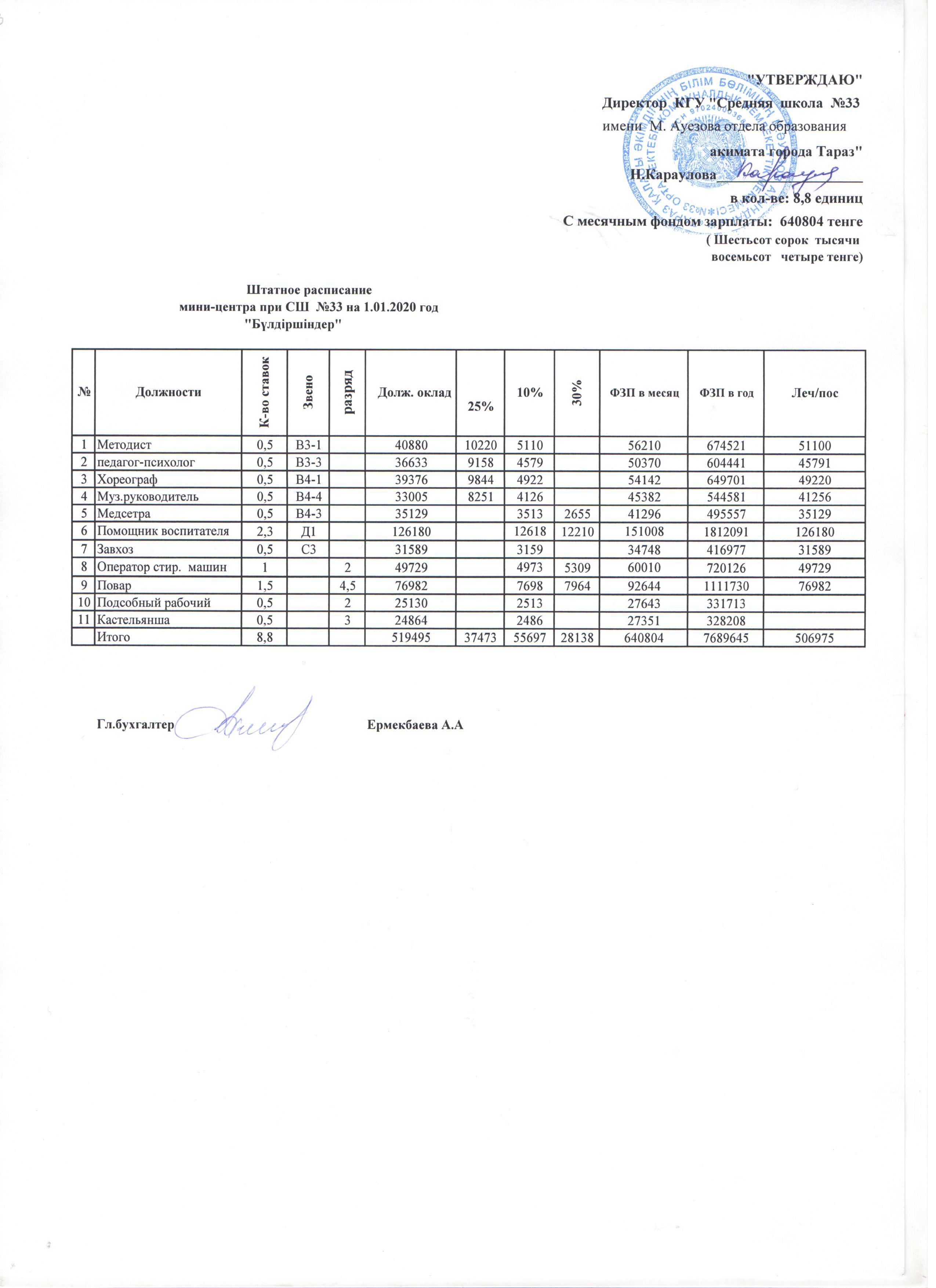17 наурыз 2020 0 1 2 3 4 5 01.01.2020 ж. Мектеп жанындағы "Бүлдіршіндер" шағын орталығының штаттық кестесі