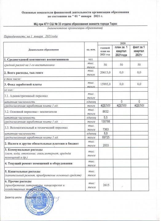 29 қаңтар 2021 0 1 2 3 4 5 Мектеп жанындағы "Бүлдіршіндер" шағын орталығының 01.01.2021 жылға қаржылық қызметтің негізгі көрсеткіштері