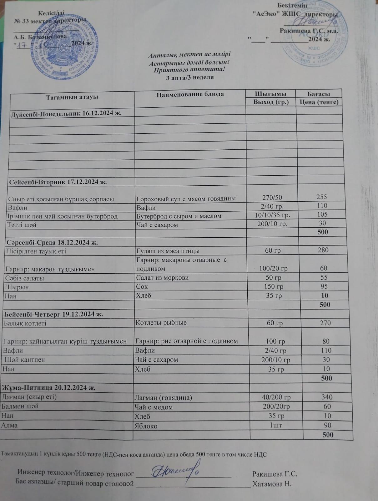 Апталық ас мәзірі 17.12-20.12.2024ж » СШ №33
