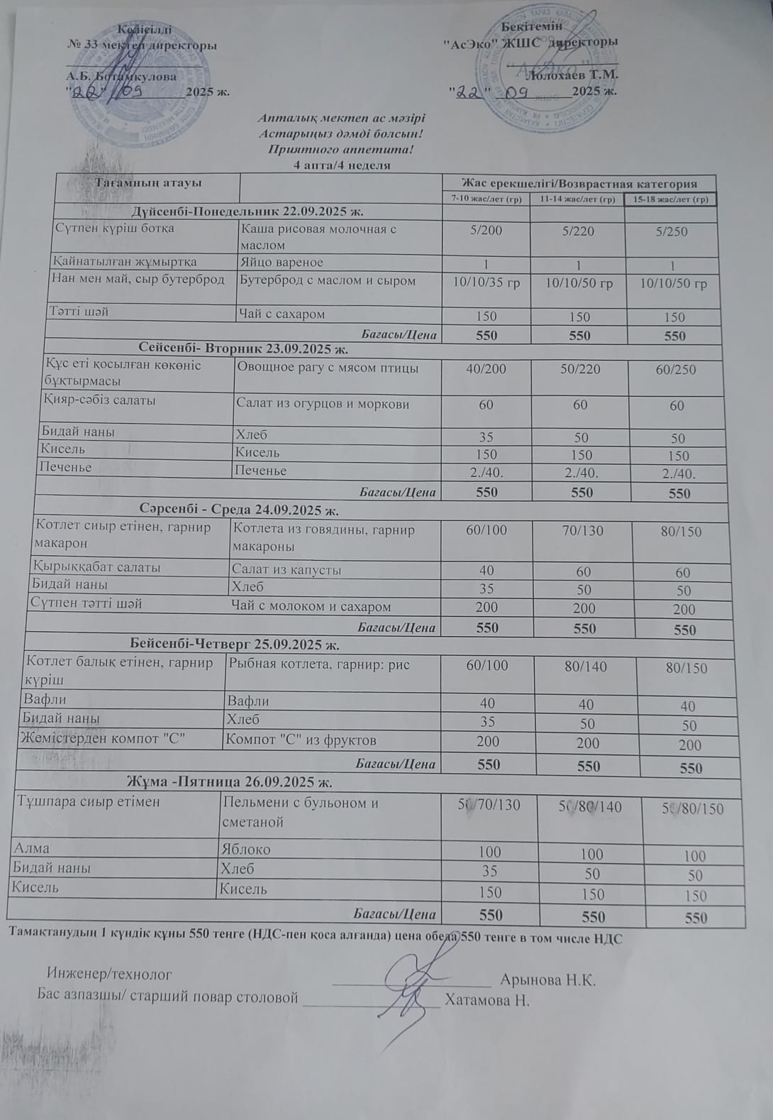Апталық ас мәзірі 22.09-26.09.25ж » СШ №33