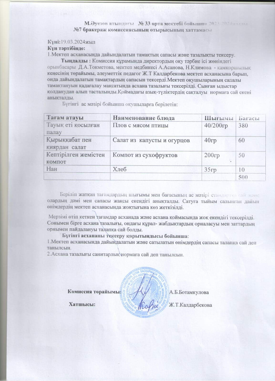 № 7 Бракераж комиссиясының отырысының хаттамасы » СШ №33