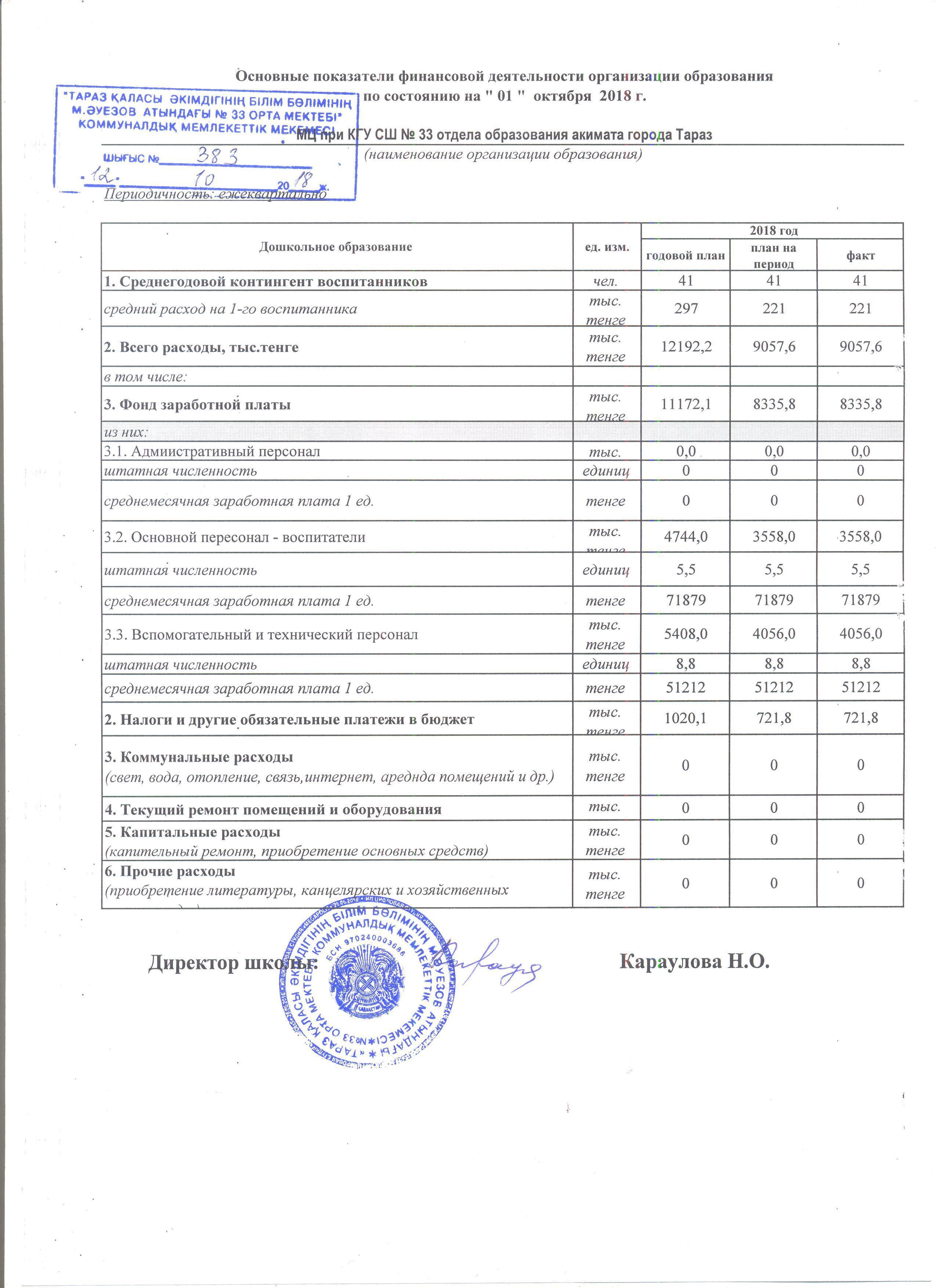 Основные показатели финансовой деятельности организации образования » СШ №33
