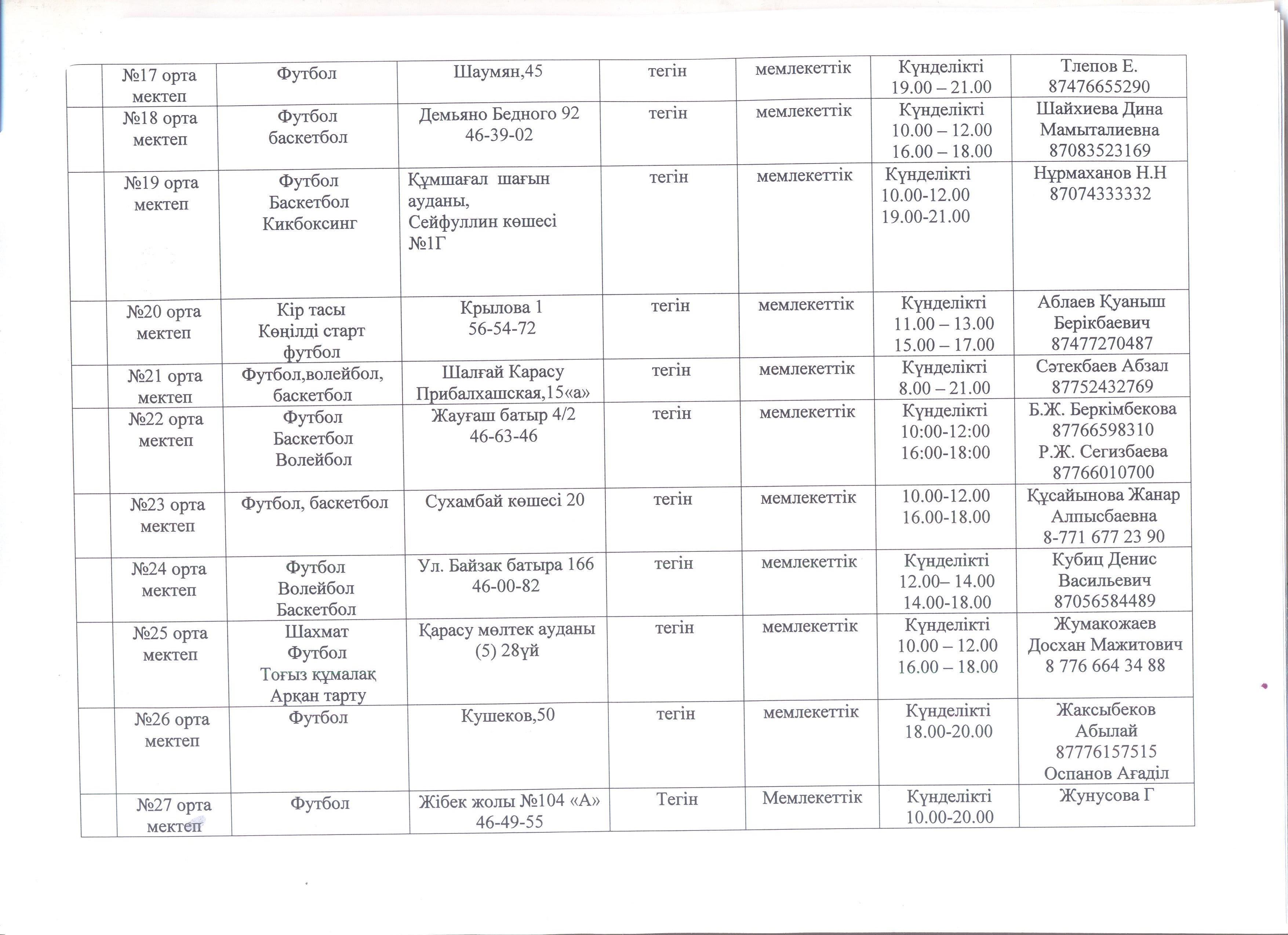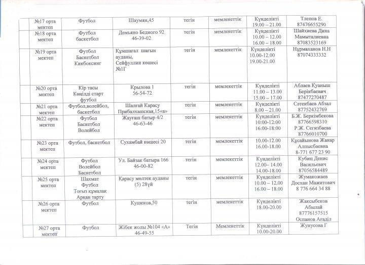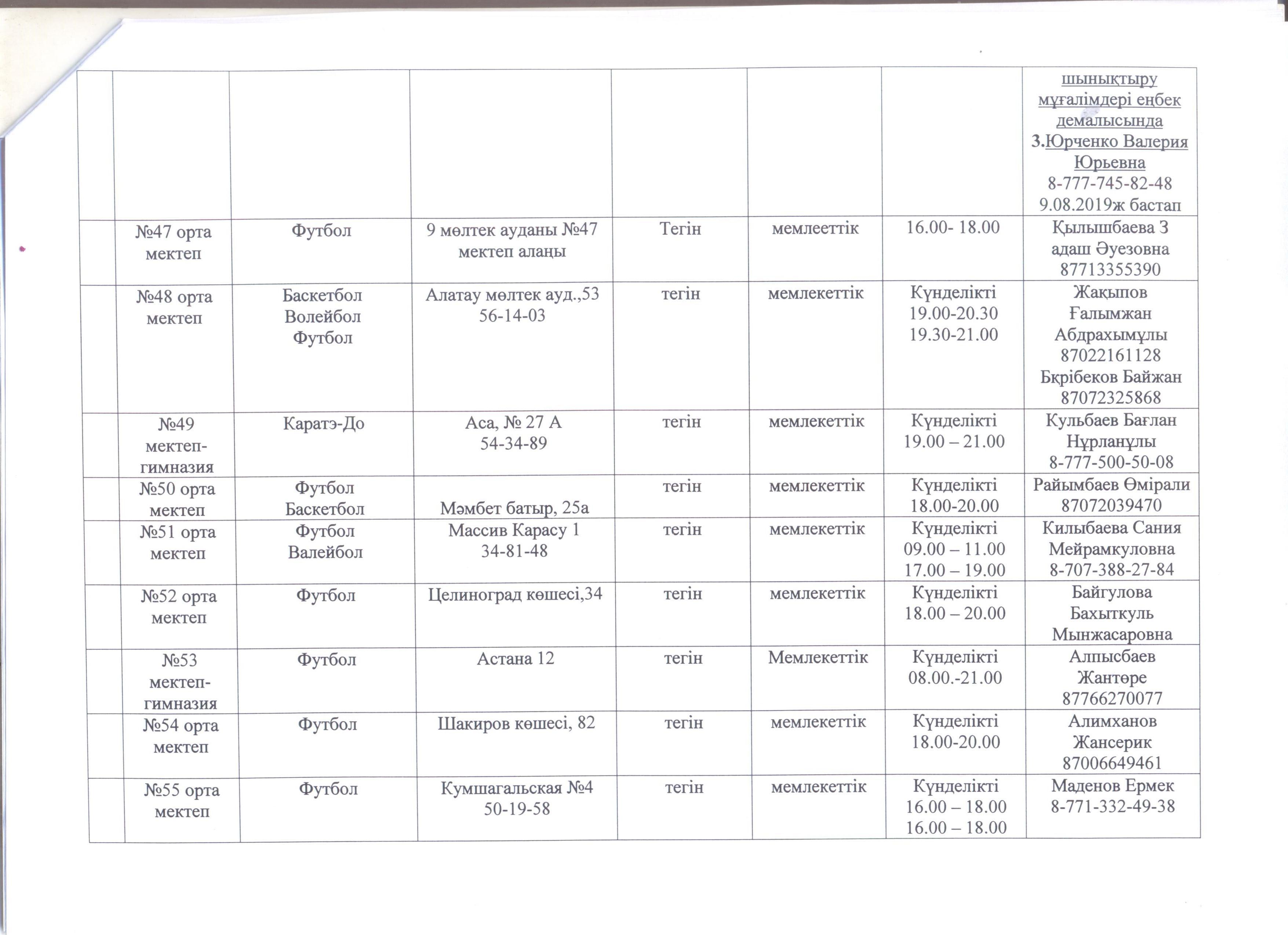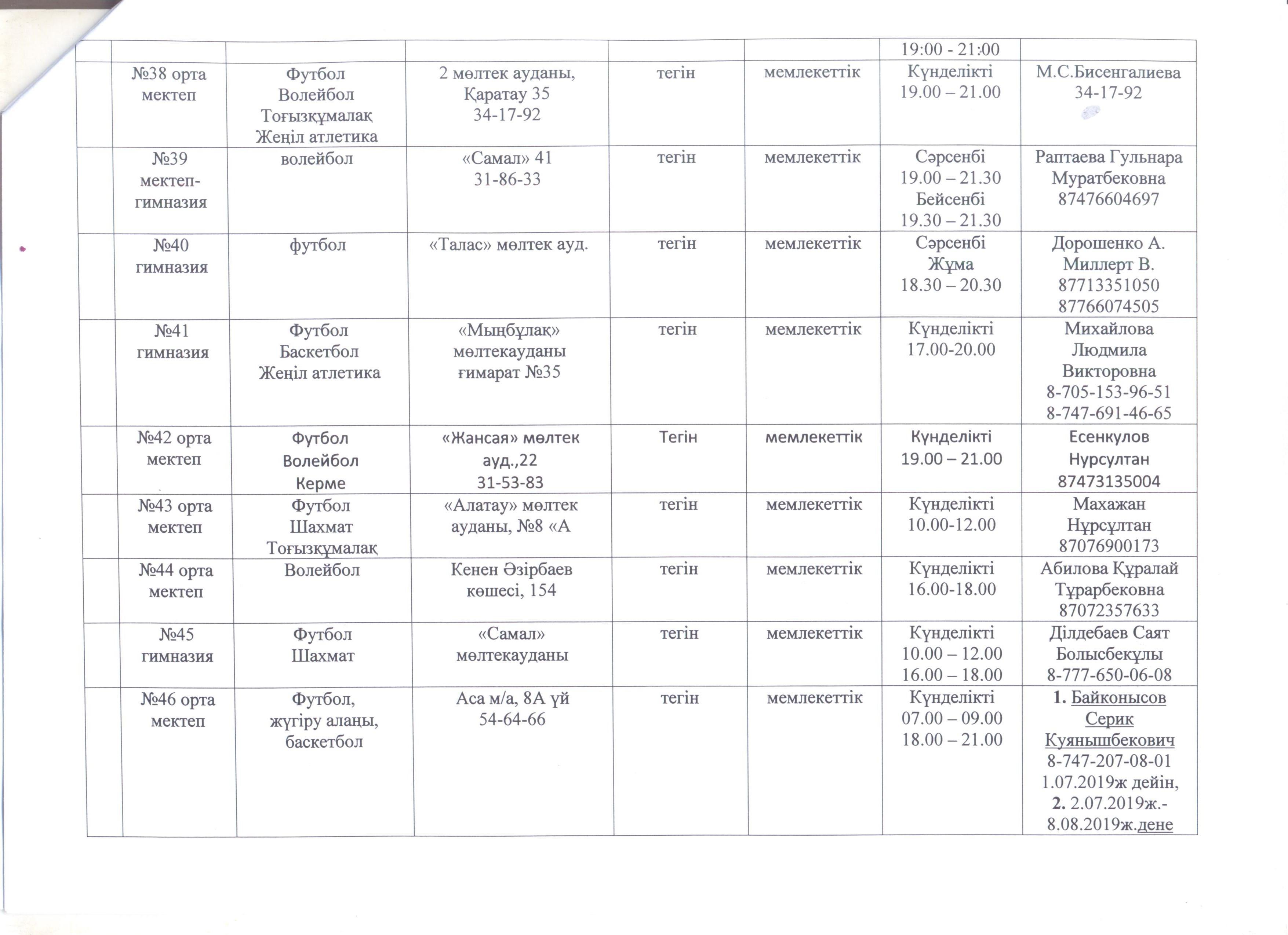 17 маусым 2019 0 1 2 3 4 5 Спорт нысанының тұрғындарға қолжетілімділігі бойынша Білім беру мекемелерінде орналасқан спорт алаңшаларының тұрғындарға қол жетімді болуын қамтамассыз ету мақсатында мектебімізде маусым-тамыз айларына арналған жұмыс кестесі