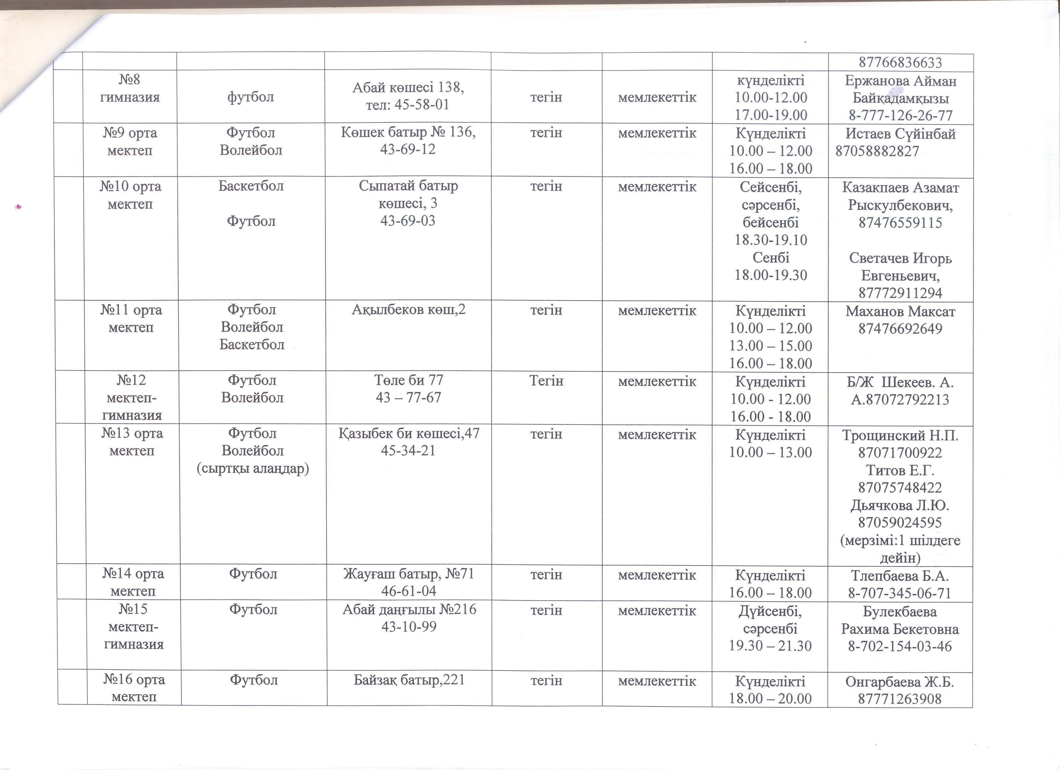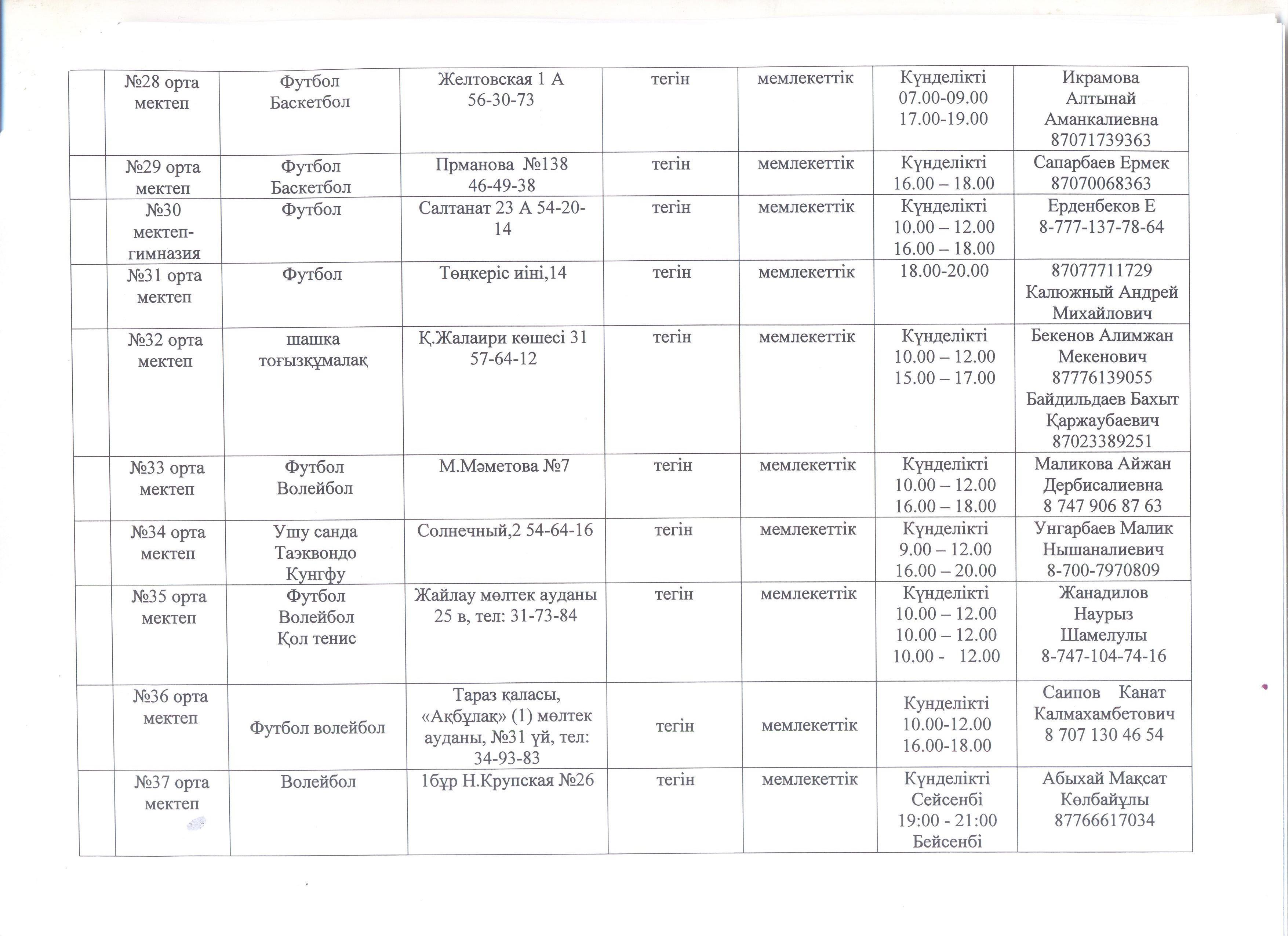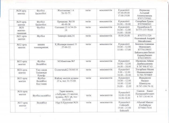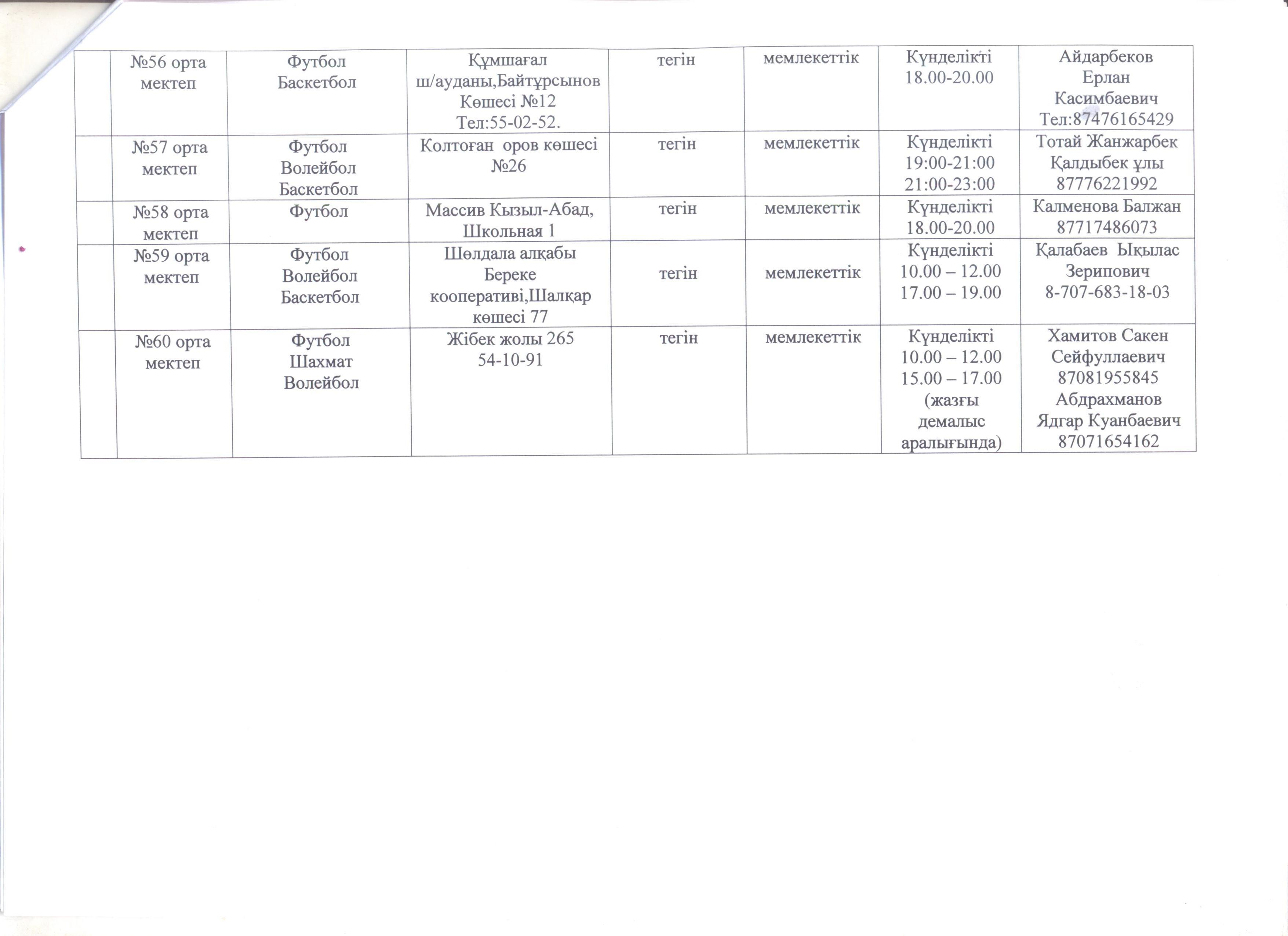 17 маусым 2019 0 1 2 3 4 5 Спорт нысанының тұрғындарға қолжетілімділігі бойынша Білім беру мекемелерінде орналасқан спорт алаңшаларының тұрғындарға қол жетімді болуын қамтамассыз ету мақсатында мектебімізде маусым-тамыз айларына арналған жұмыс кестесі