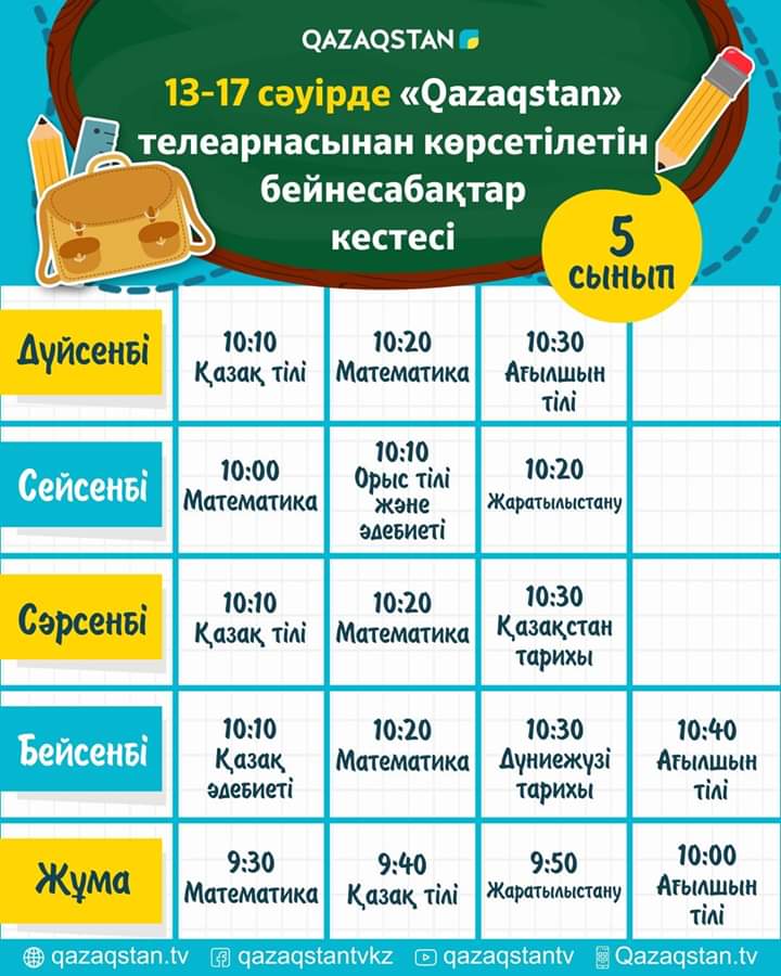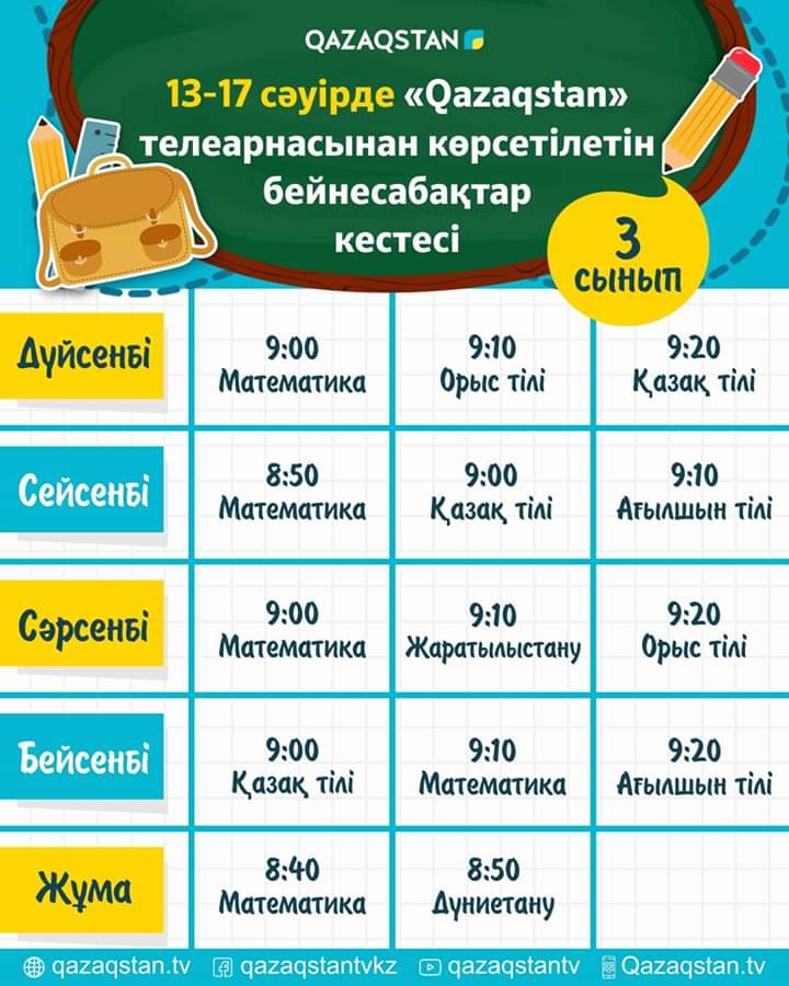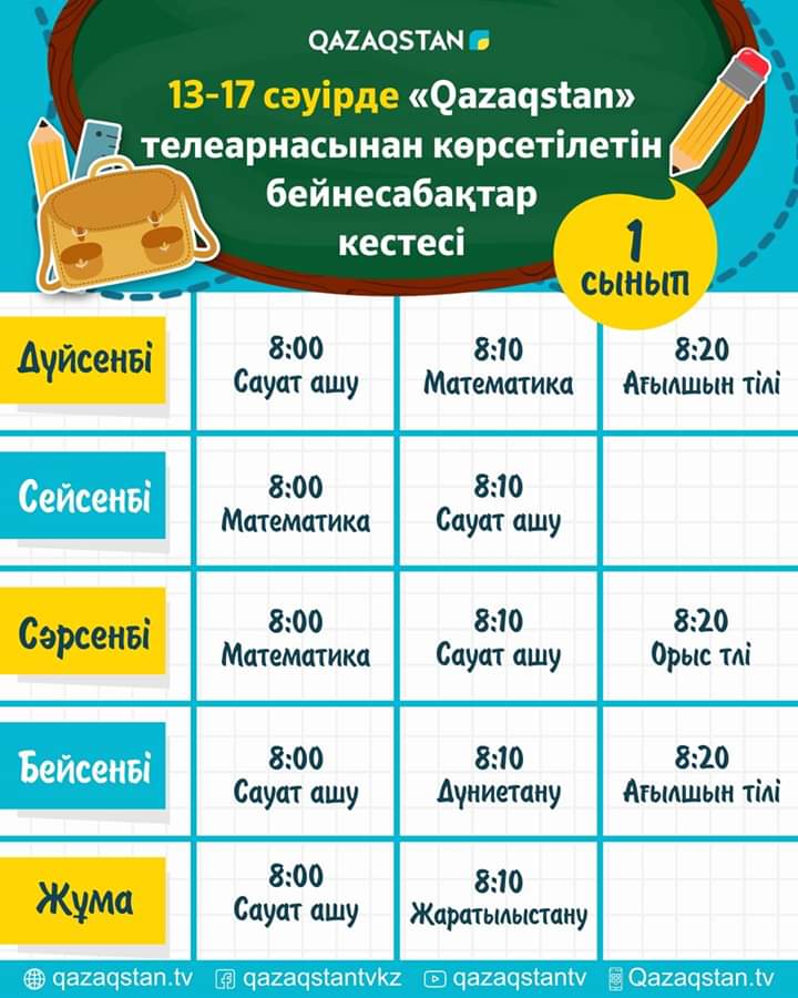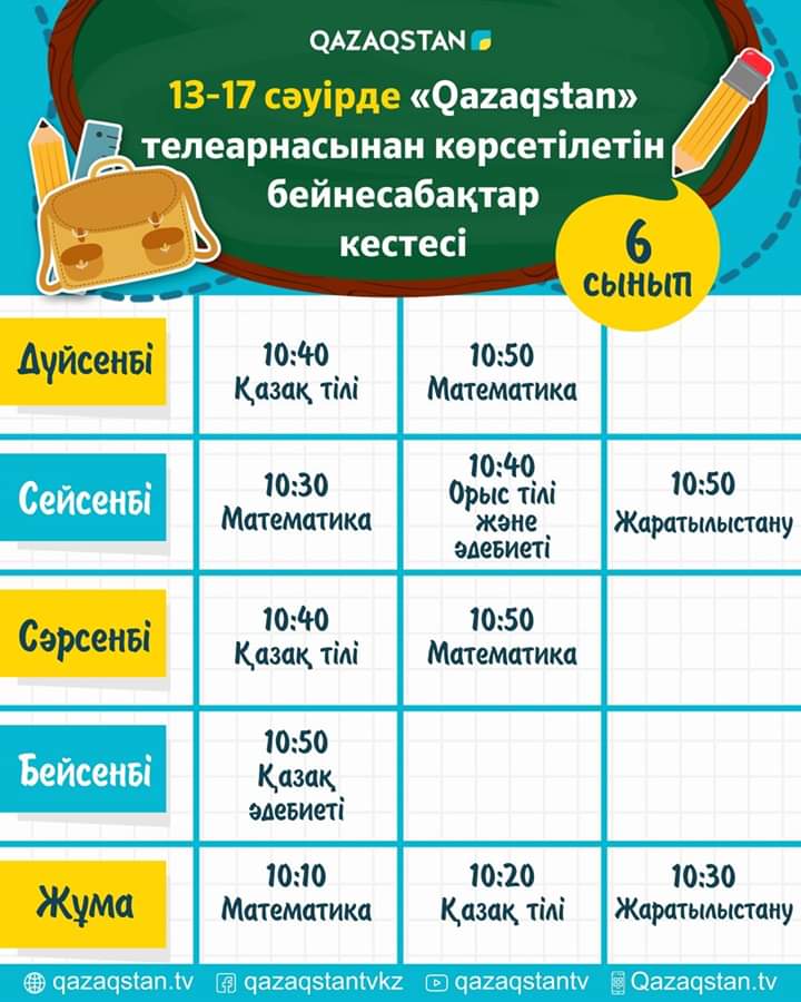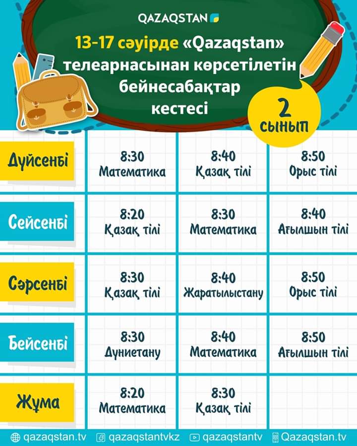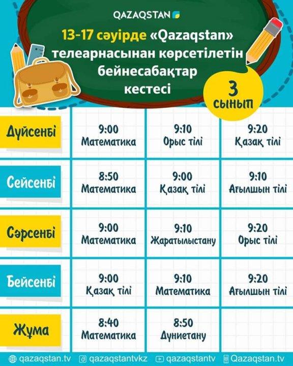 СШ №33 » Информация » 13 сәуірден бастап еліміздің орта білім ұйымдарына арналған бейнесабақтар "Qazagstan" Ұлттық телеарнасынан көрсете бастайды. Телесабақтар дүйсенбі 08:00-ден 11:00 аралығында 1-6 сыныптың оқу пәндері бойынша қазақ тілінде өткізіледі.