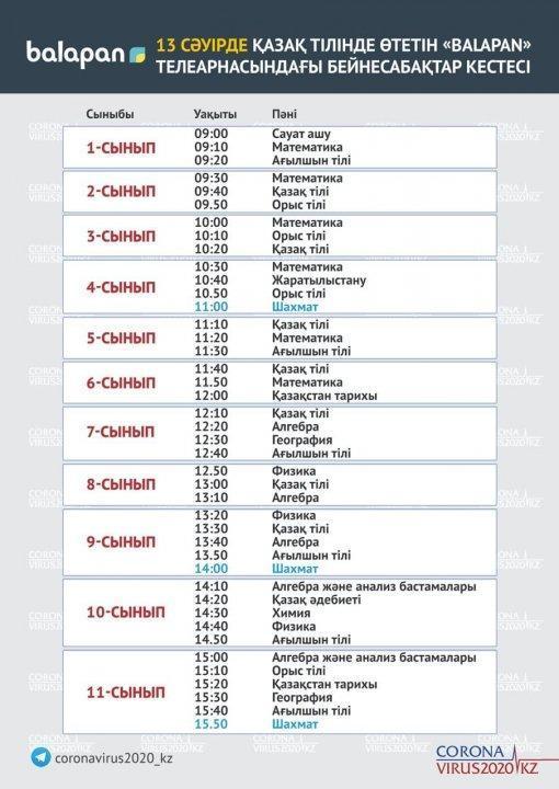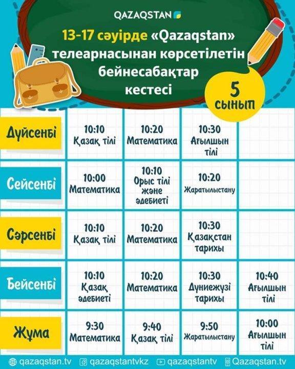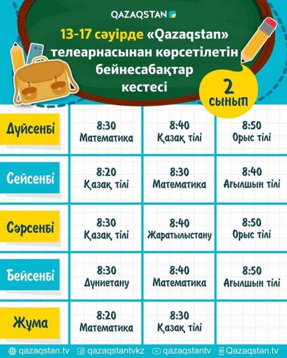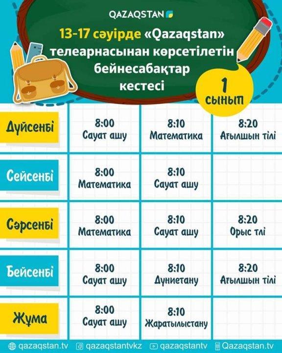 13 сәуірден бастап еліміздің орта білім ұйымдарына арналған бейнесабақтар "Qazagstan" Ұлттық телеарнасынан көрсете бастайды. Телесабақтар дүйсенбі 08:00-ден 11:00 аралығында 1-6 сыныптың оқу пәндері бойынша қазақ тілінде өткізіледі.