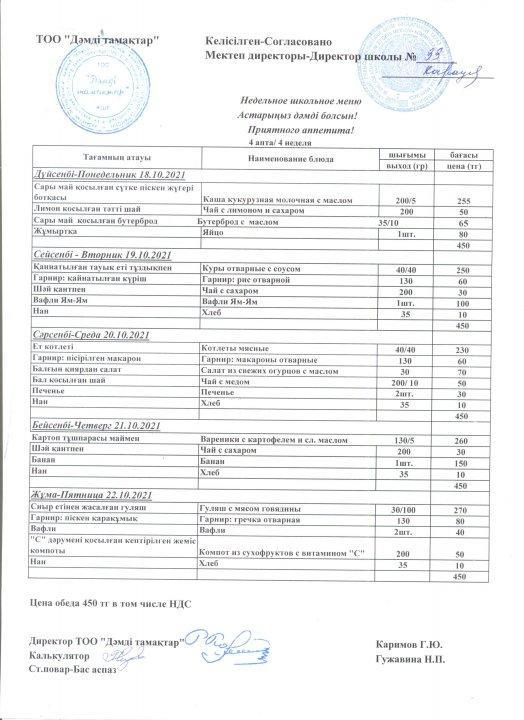 Мектеп асханасының апталық ас мәзірі » СШ №33