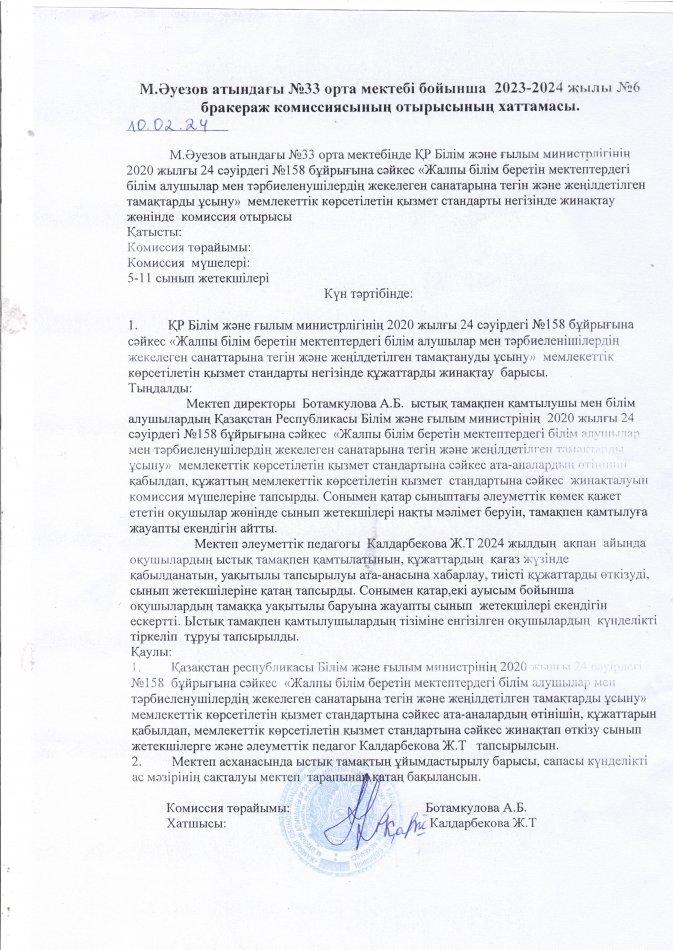 Тамақтану саасын бақылау бойынша бракераж комиссия актісі » СШ №33
