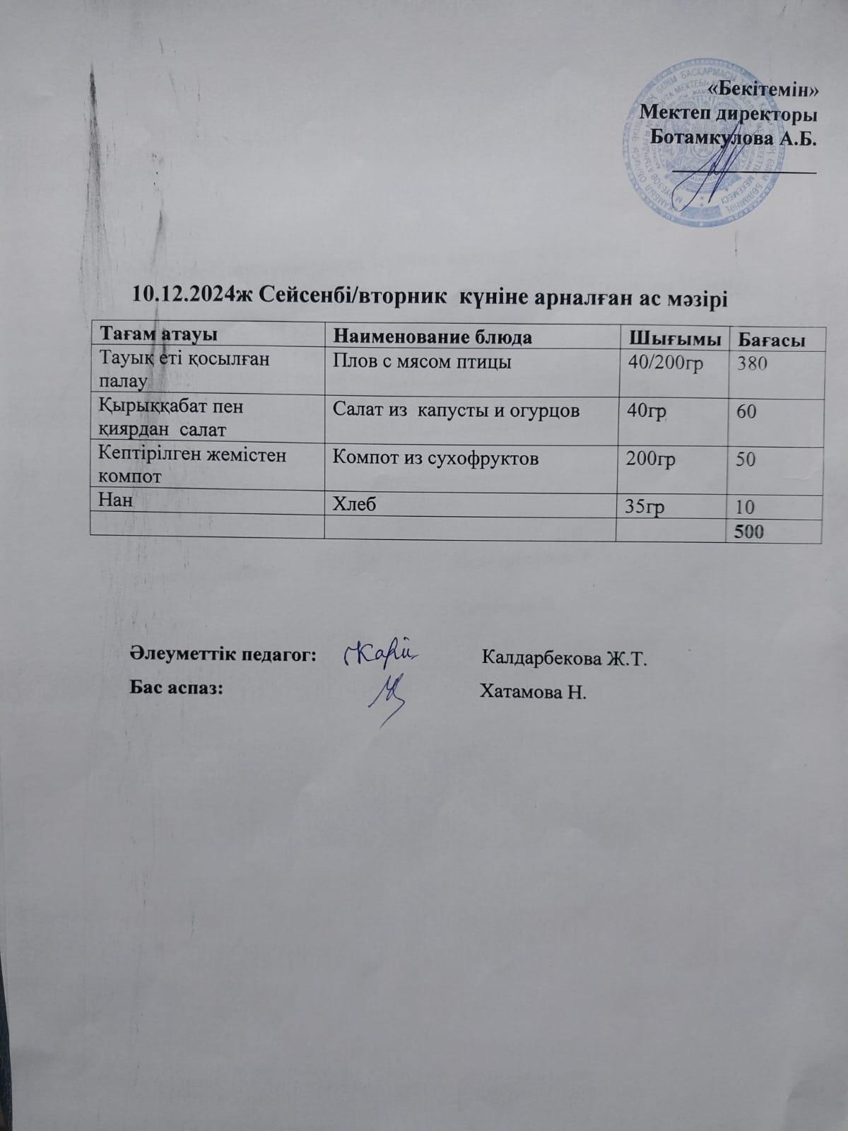 10.12.2024ж Күндік мәзір