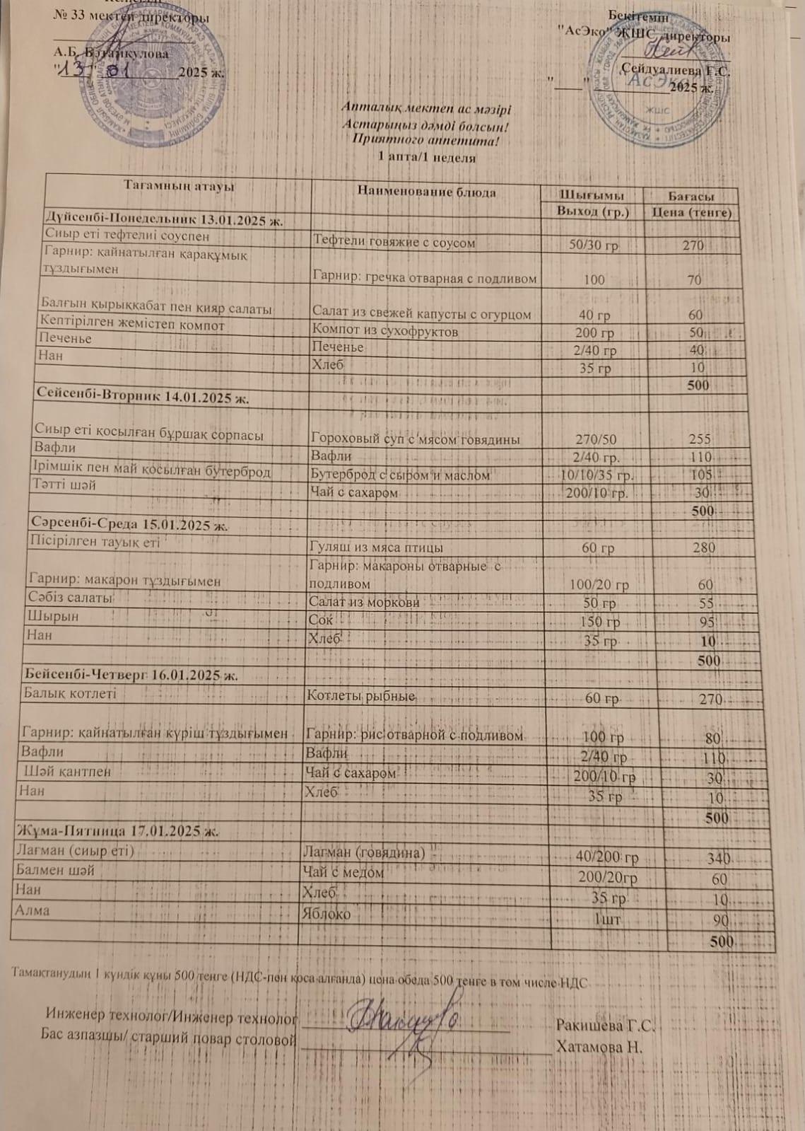 Апталық ас мәзірі 13.01-17.01.2025ж » СШ №33