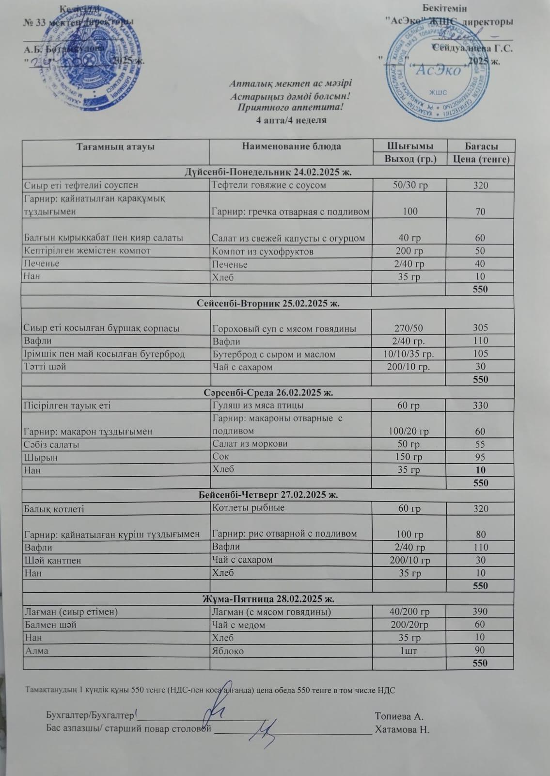 Апталық ас мәзірі 24.02-28.02.2025ж » СШ №33