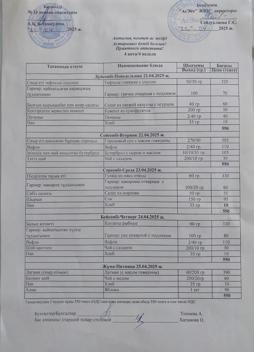Апталық ас мәзірі 21.04.-25.04.2025ж