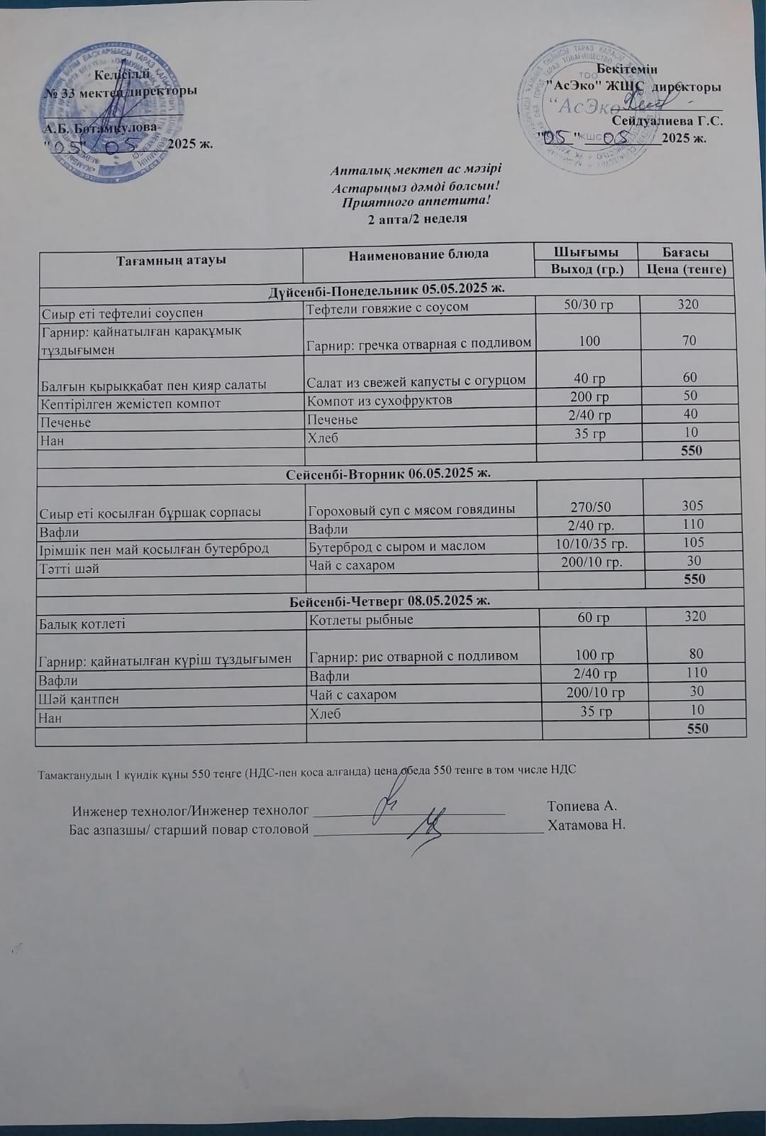 Апталық ас мәзірі 05.05-08.05.2025ж » СШ №33