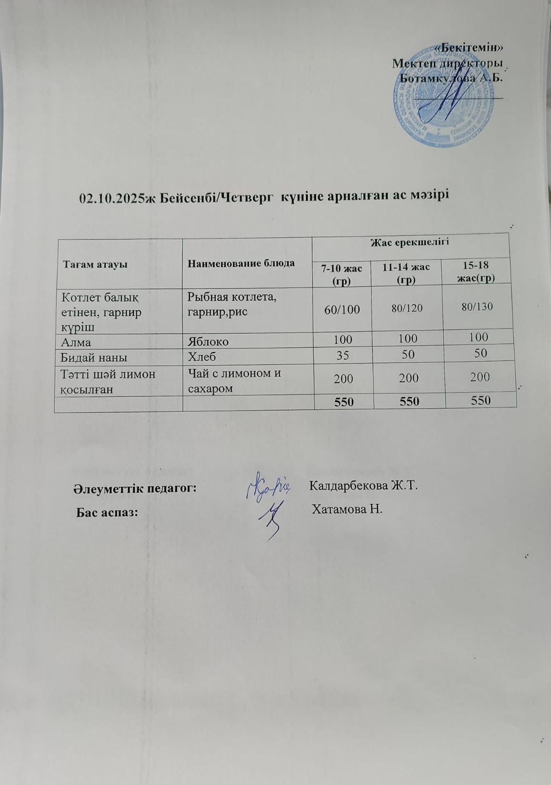 Күндік ас мәзірі 02.10.2025