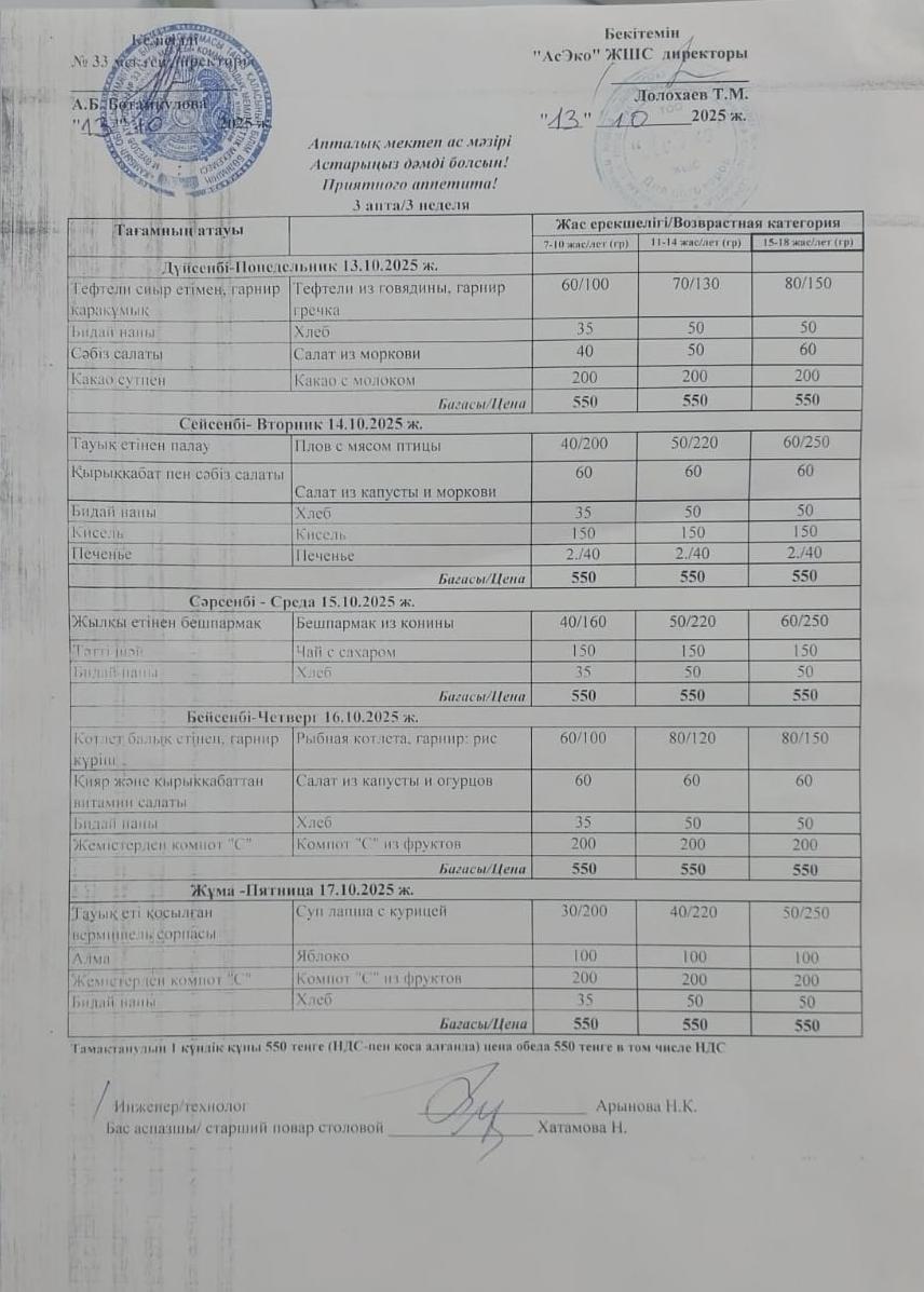 Апталық ас мәзірі 13.10-17.10.25 » СШ №33