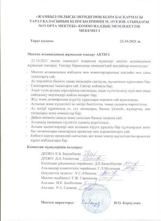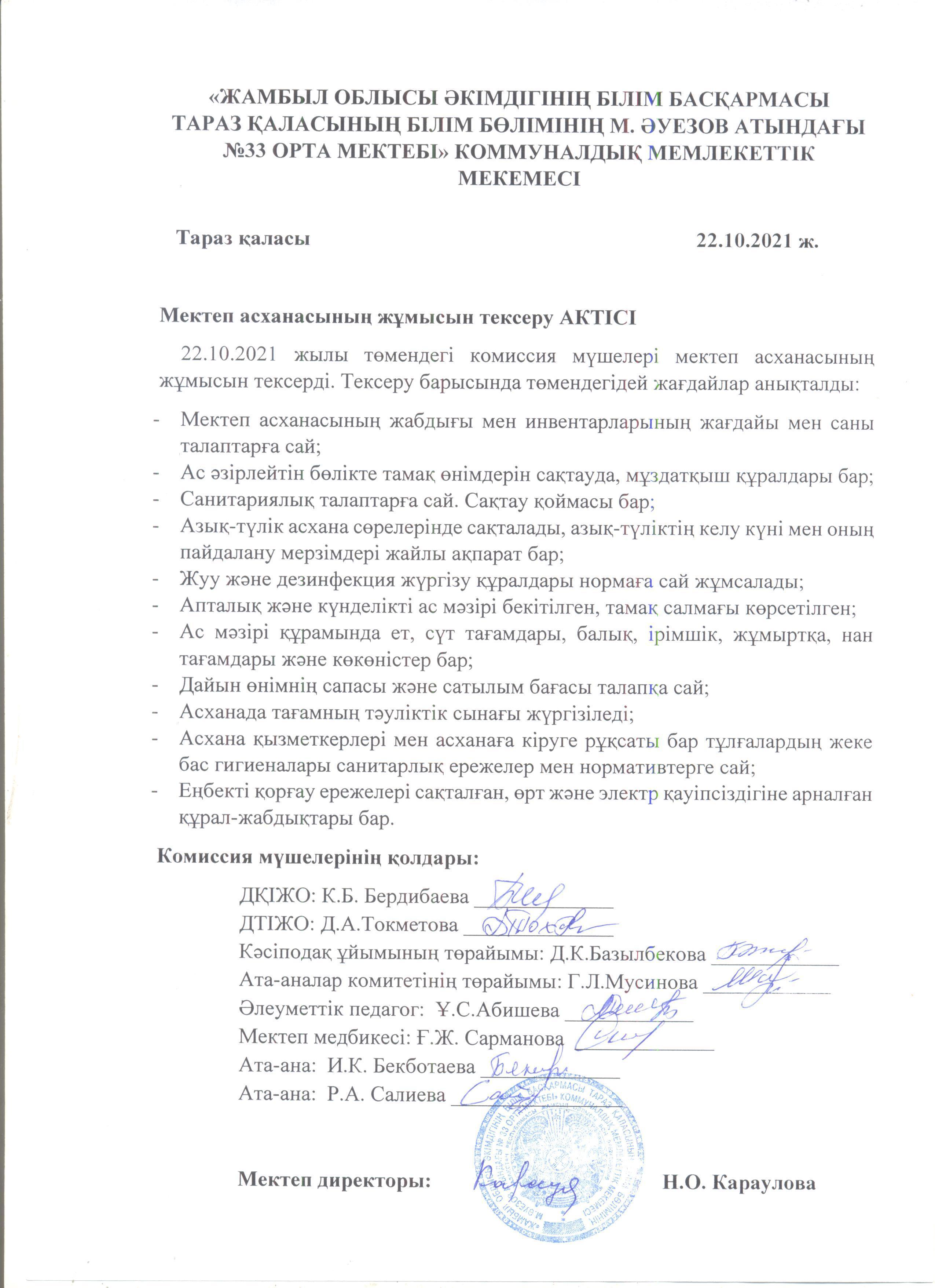 Мектеп асханасының жұмысын тексеру АКТІСІ » СШ №33