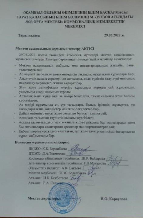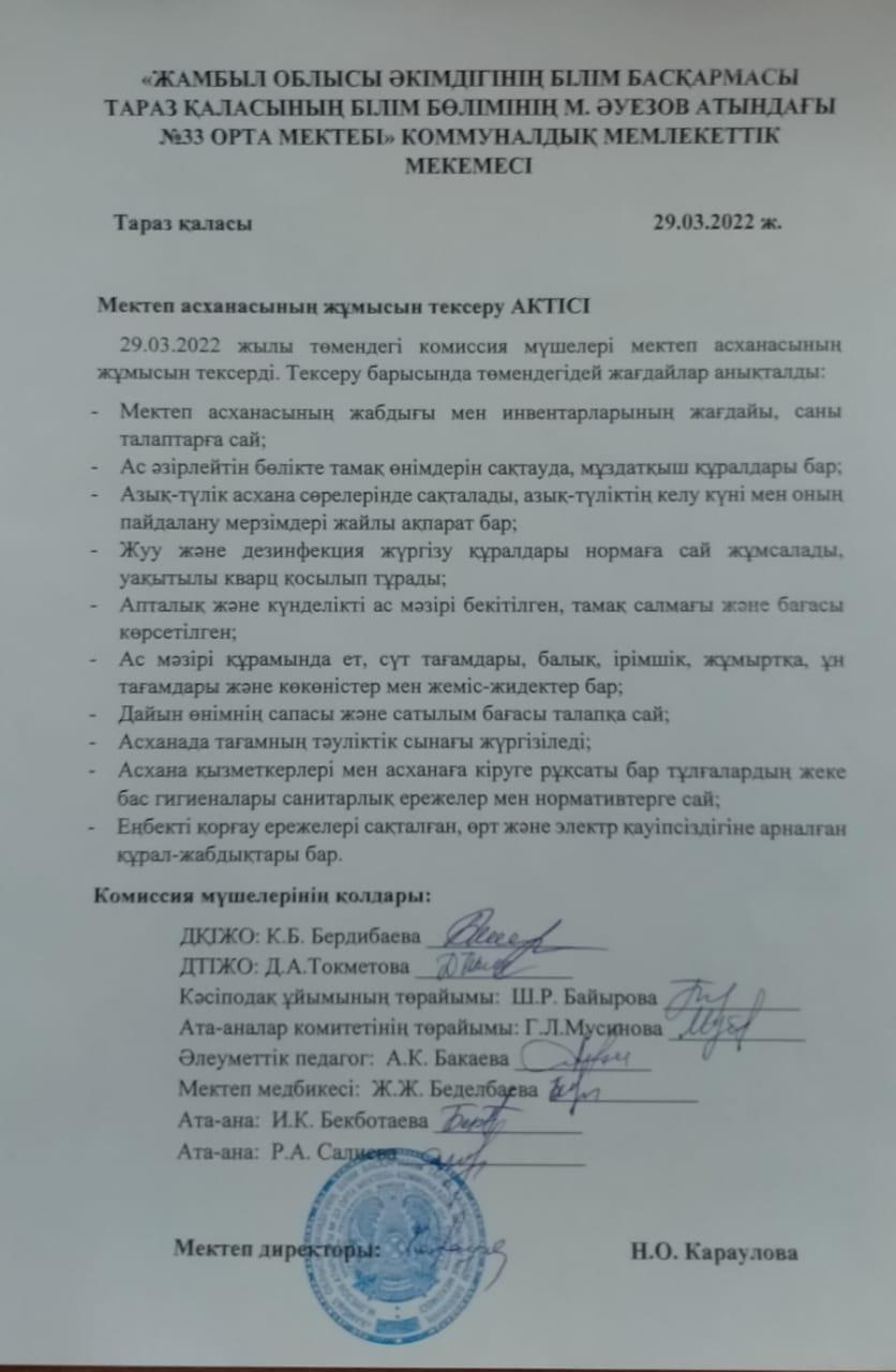 Мектеп асханасының жұмысын тексеру АКТІСІ » СШ №33